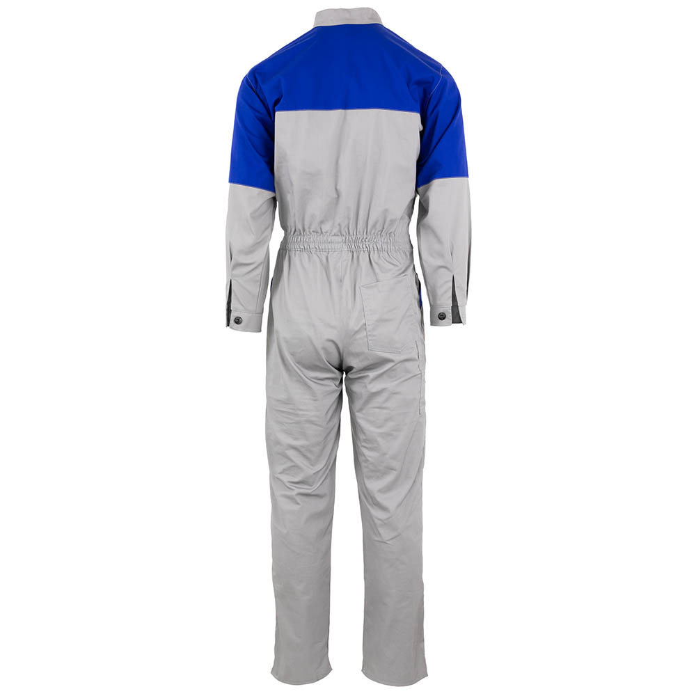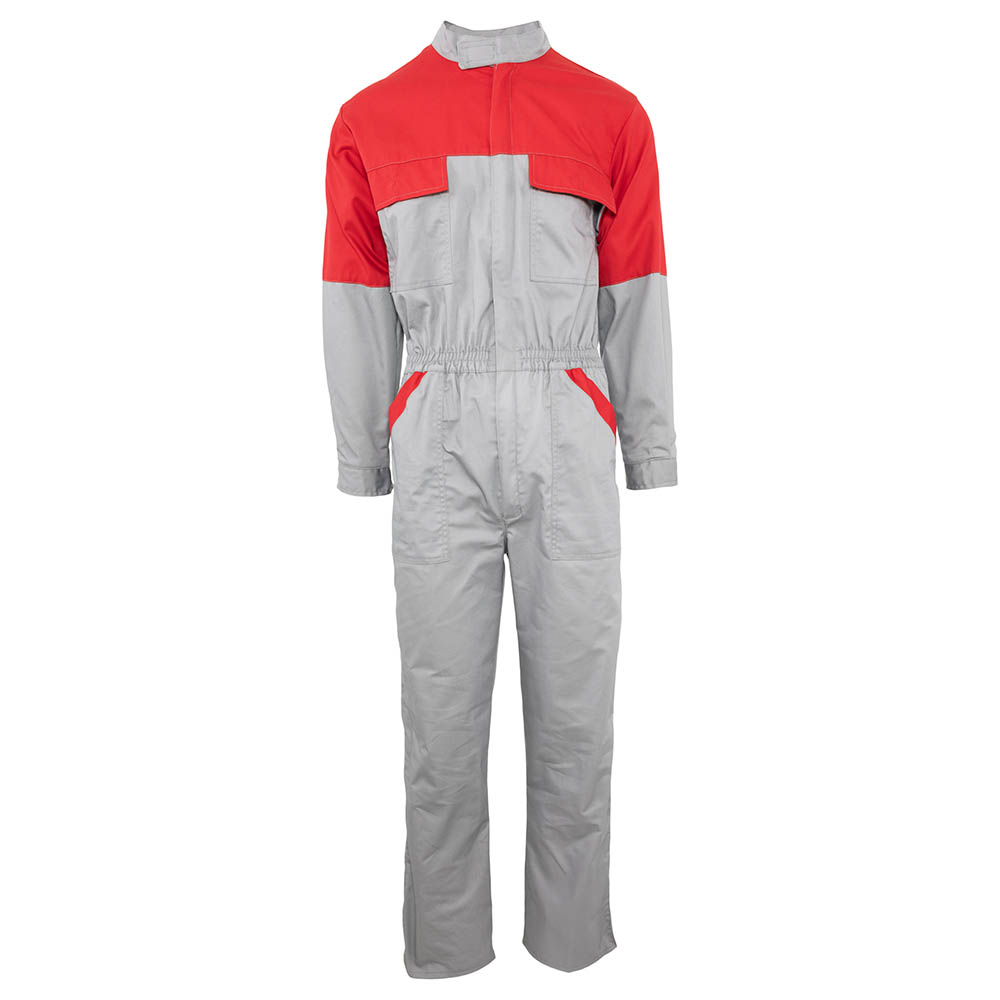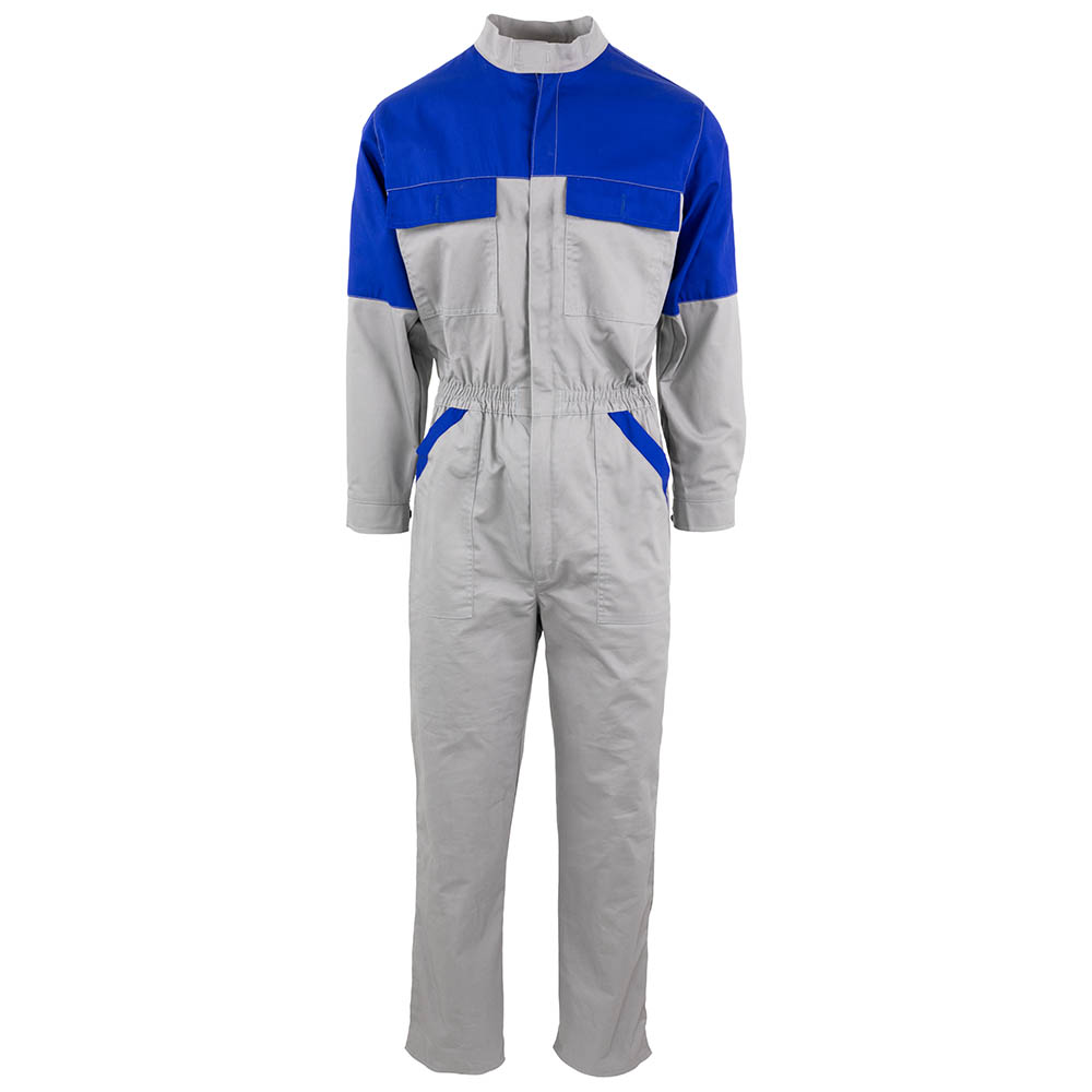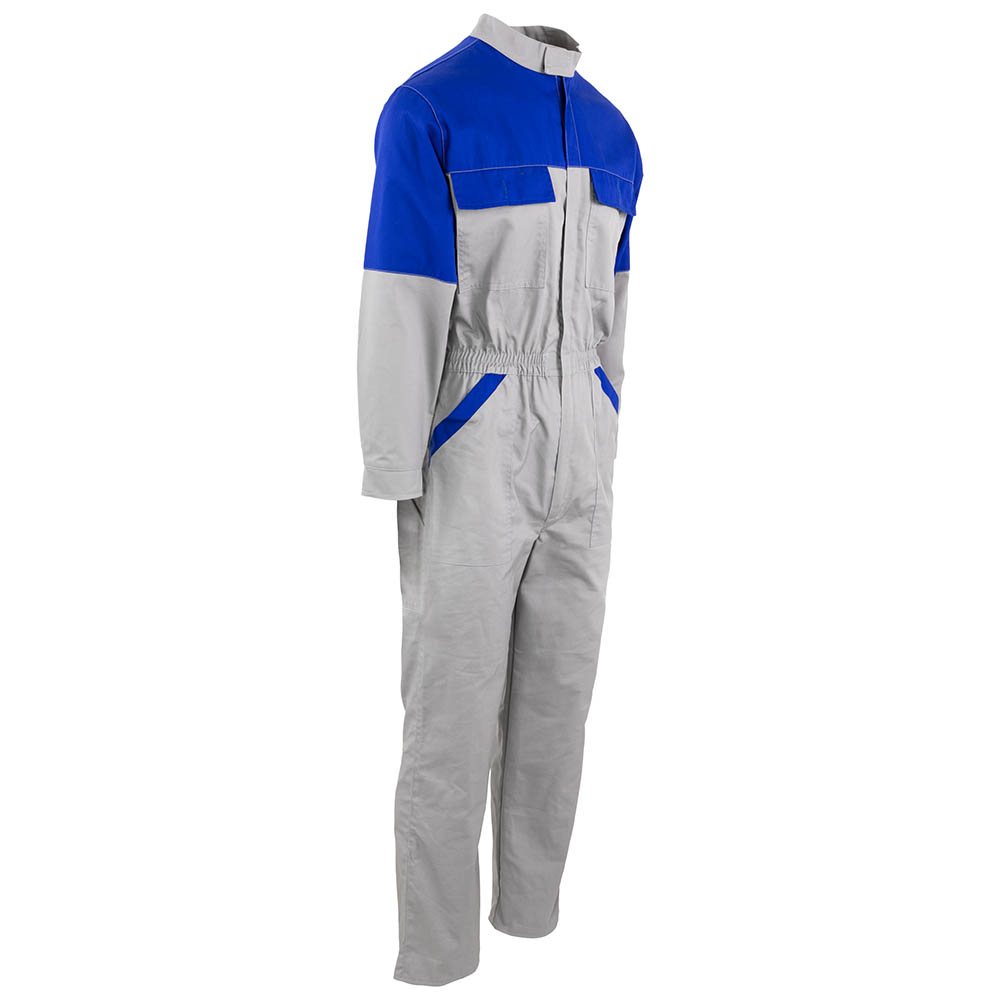 CONSTRUCTIE: combinezon de protectie cu guler inalt, inchidere cu fermoar acoperit cu fenta, cu buzunare frontale aplicate, 2 la piept inchise cu butoni, 2 la nivelul taliei deschise, elastic in talie;