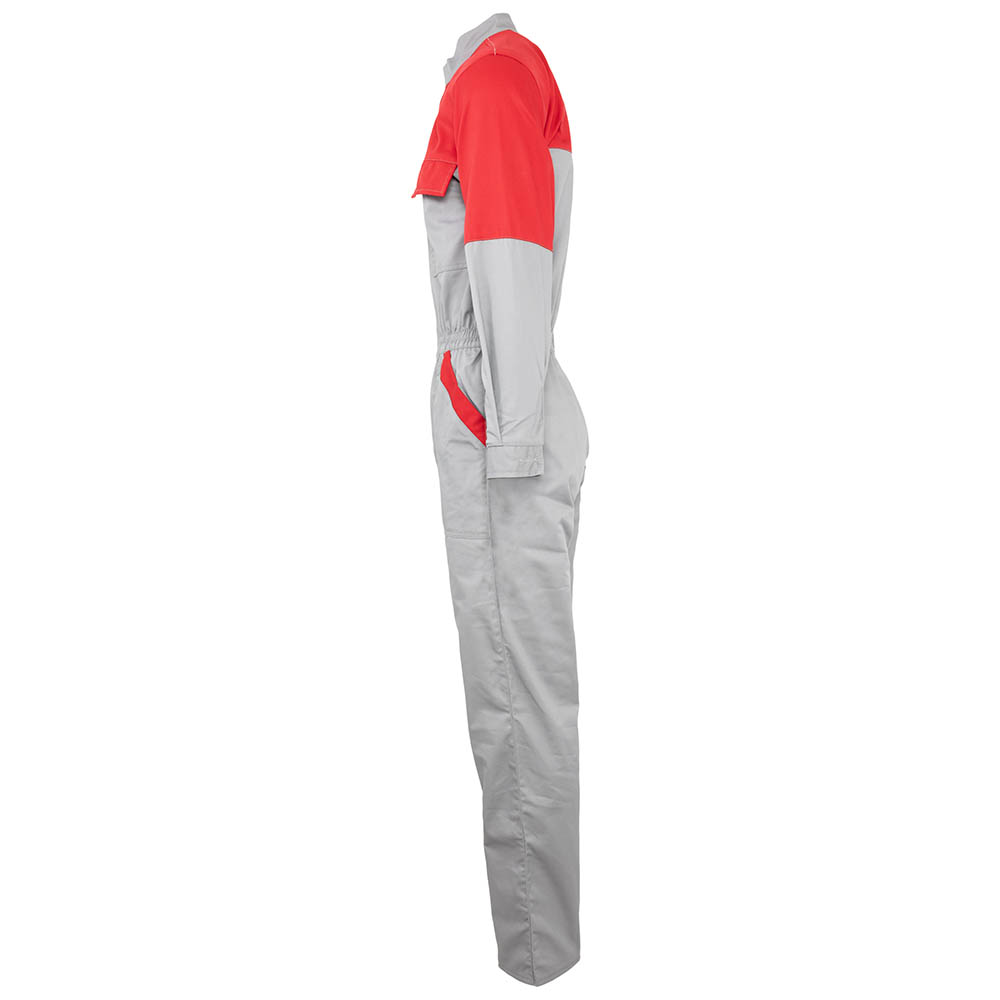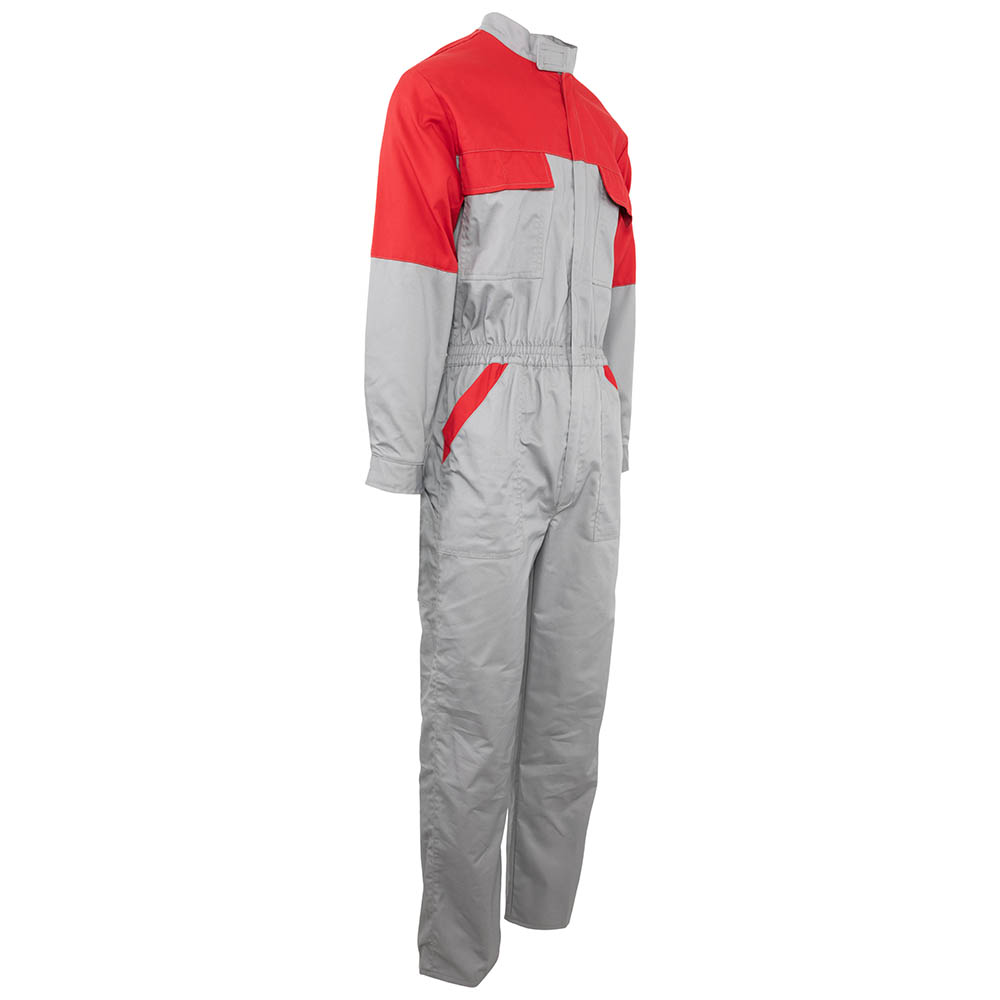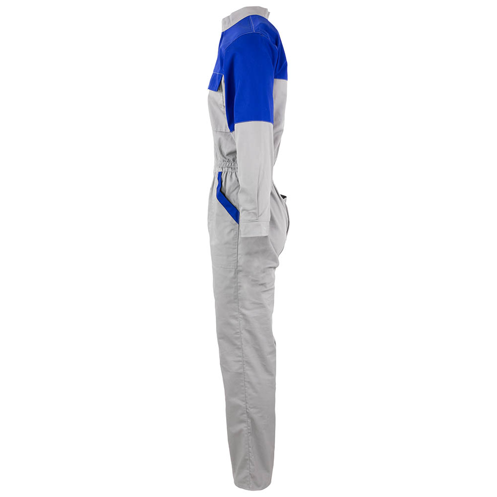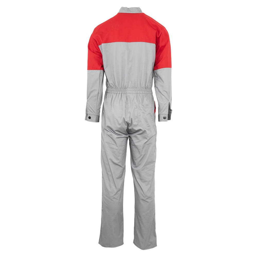 CONSTRUCTIE: combinezon de protectie cu guler inalt, inchidere cu fermoar acoperit cu fenta, cu buzunare frontale aplicate, 2 la piept inchise cu butoni, 2 la nivelul taliei deschise, elastic in talie;