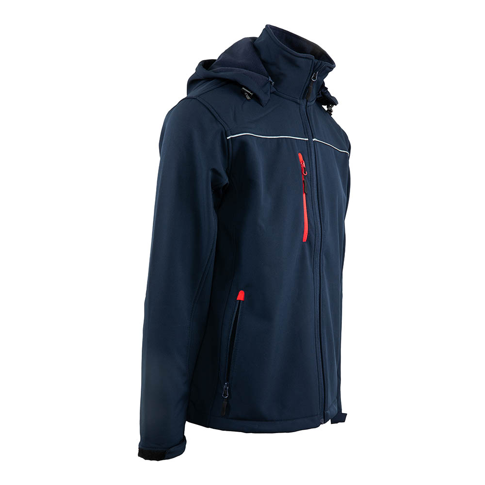 CONSTRUCTIE: jacheta softshell necaptusita, inchidere cu fermoar, 2 buzunare laterale si unul la piept inchise cu fermoar, la interior un buzunar fara inchidere, maneci terminate cu tiv si ajustare cu banda velcro, gluga detasabila.