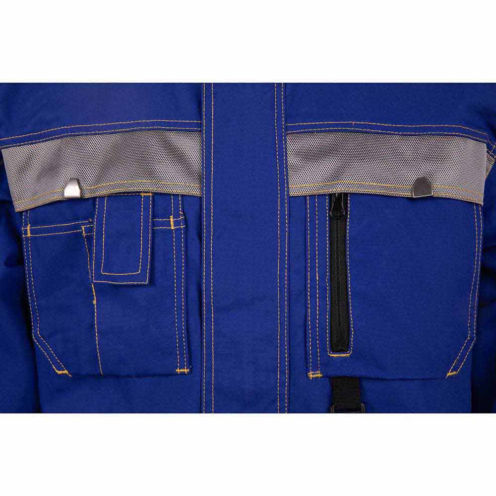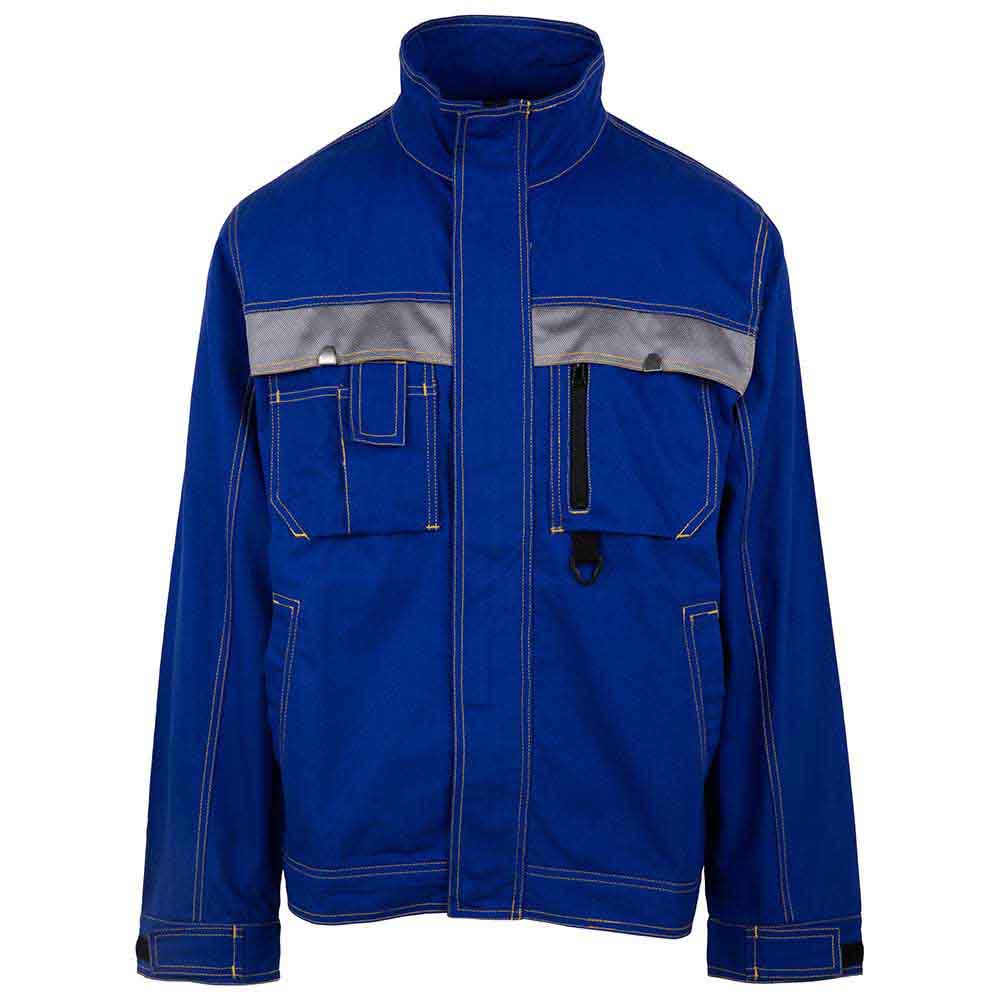 CONSTRUCTIE: jacheta de lucru, inchisa frontal cu fermoar, acoperit cu fenta inchisa cu capse, multiple buzunare, elemente reflectorizante (banda 5 cm. latime) aplicate pe fata in dreptul pieptului, maneci drepte terminate cu manseta.