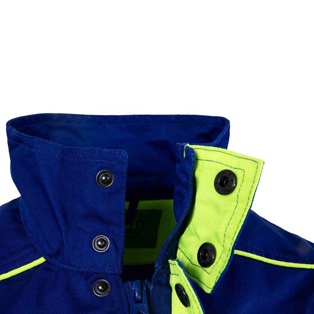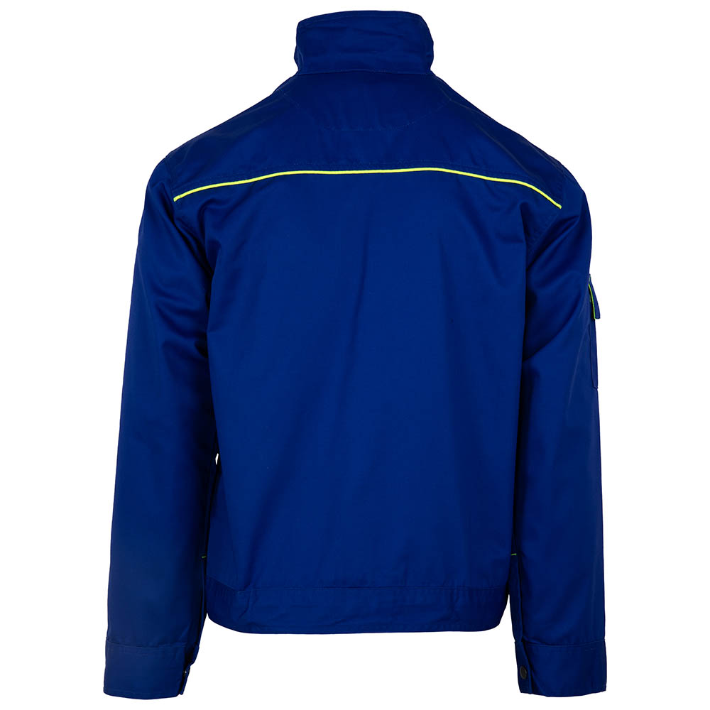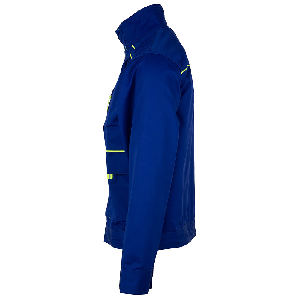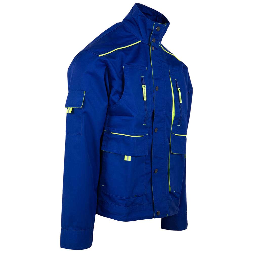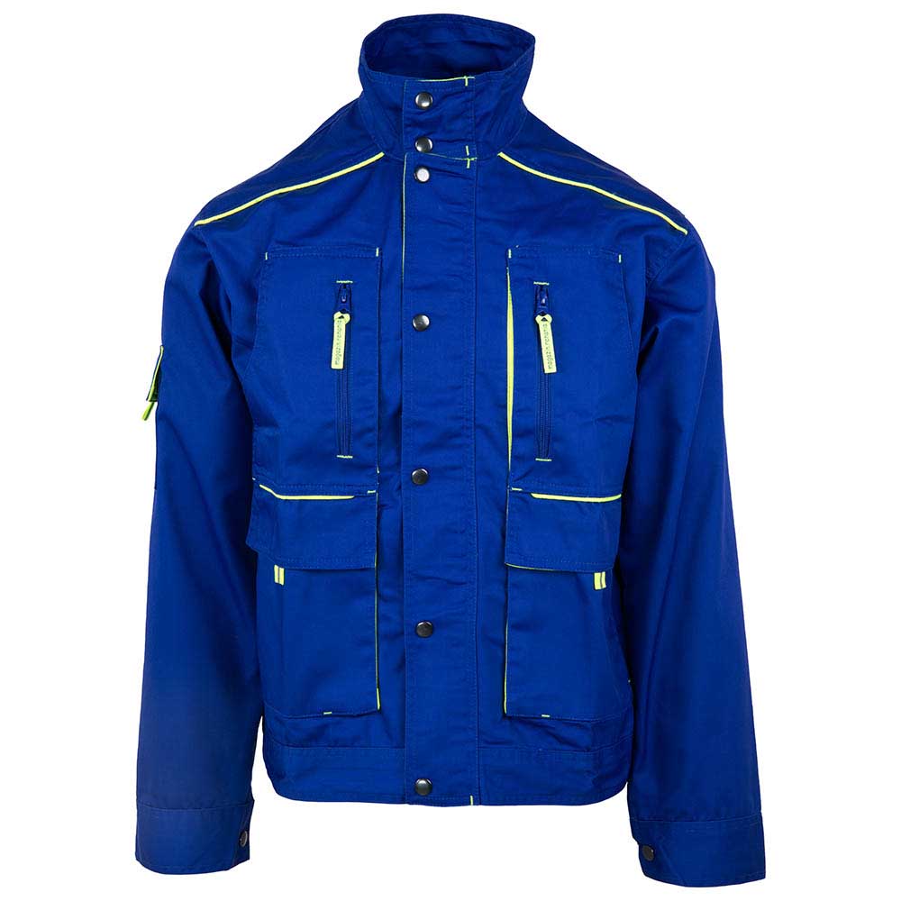 CONSTRUCTIE: jacheta de lucru, inchisa frontal cu fermoar, acoperit cu fenta inchisa cu capse, 4 buzunare frontale (2 la piept inchise cu fermoar si 2 laterale inchise cu clapeta si velcro), maneci drepte terminate cu manseta.