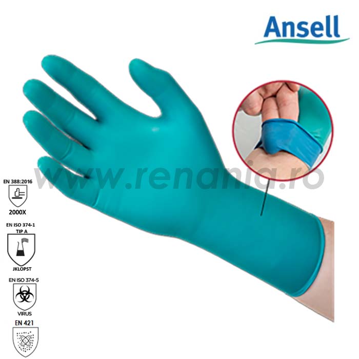 APLICATII: medii de lucru care necesita protectie impotriva substantelor chimice de tip A – n heptan (J), soda caustica 40% (K), acid sulfuric 96% (L), amoniac 25% (O), apa oxigenata 30% (P), acid fluorhidric 40% (S), formaldehida 37% (T), la microorganisme si virusi, contaminari radioactive, risc de categ.III.